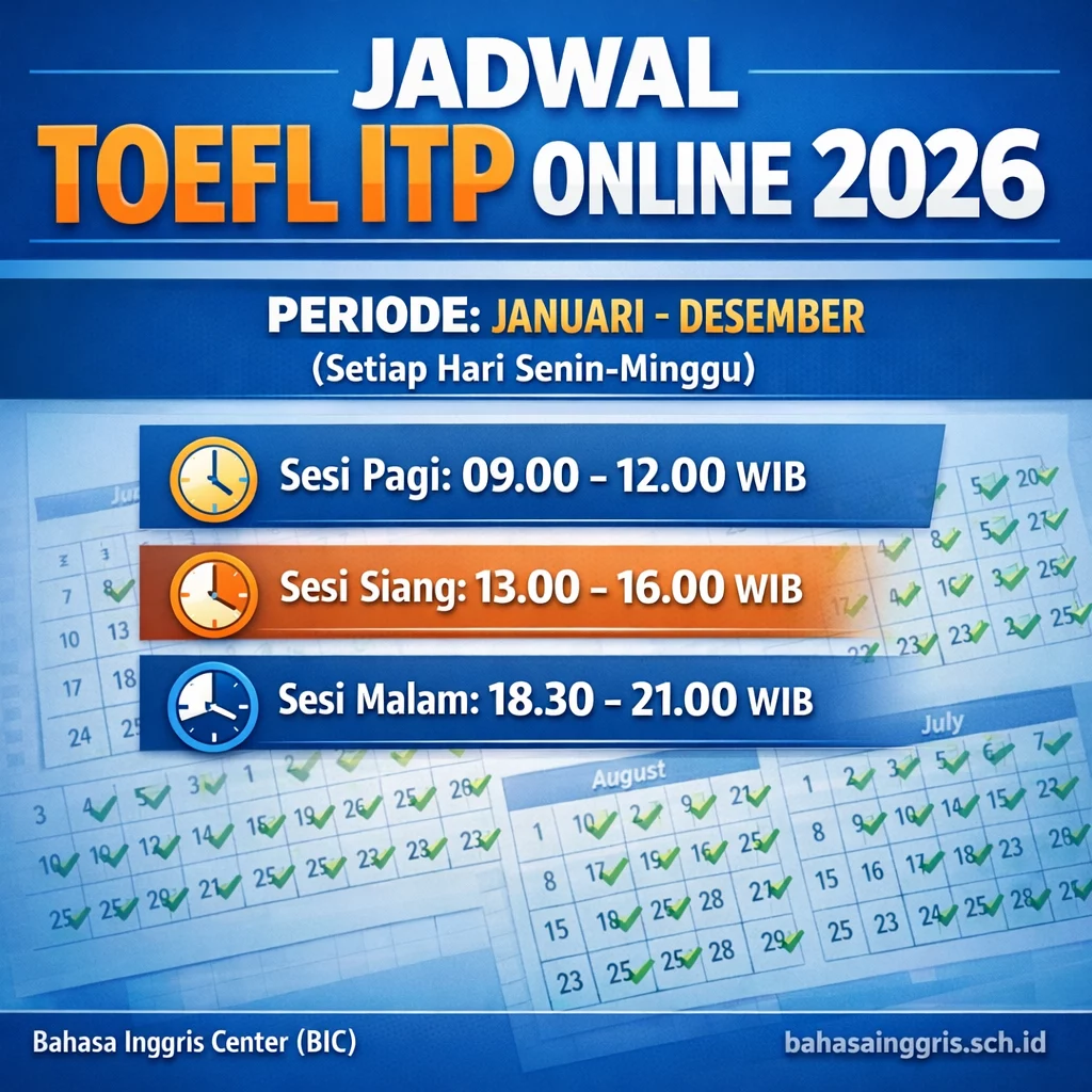 Jadwal TOEFL ITP® BIC memuat tanggal ujian, jam sesi, dan kuota kursi untuk membantu Anda memilih sesi dan mengamankan pendaftaran sebelum penuh.